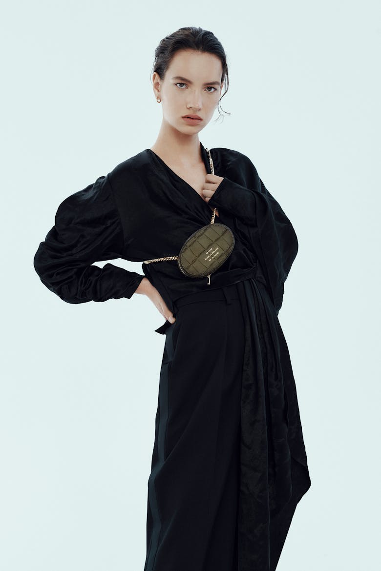 Small, structured, oval-shaped bag made of olive-green leather embossed in a crocodile-skin pattern. Can be worn across the body, on the waist, or as a clutch. Built-in mirror and drawstring pouch.
