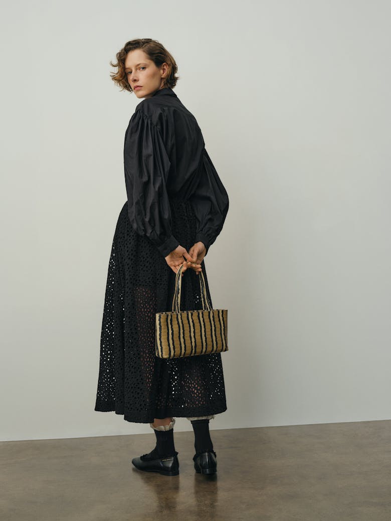 A handy little tote constructed from a python-embossed leather in beige and black stripes. Worn over the shoulder. Zipper closure. One interior compartment with a small zippered pocket inside. Perfectly on-the-go.