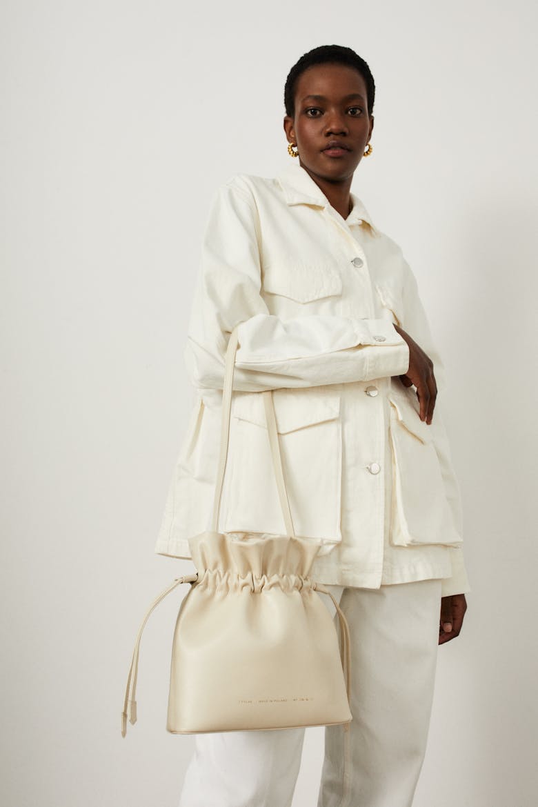 Supple and comfortable drawstring bucket bag in cream leather. Very roomy. Can be worn across the body or on the shoulder. One compartment with an internal pocket. Closed with a drawstring.