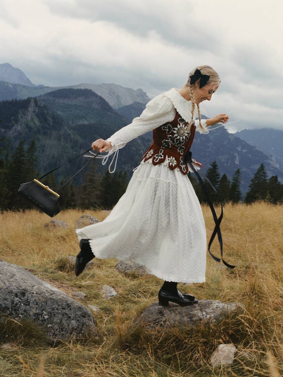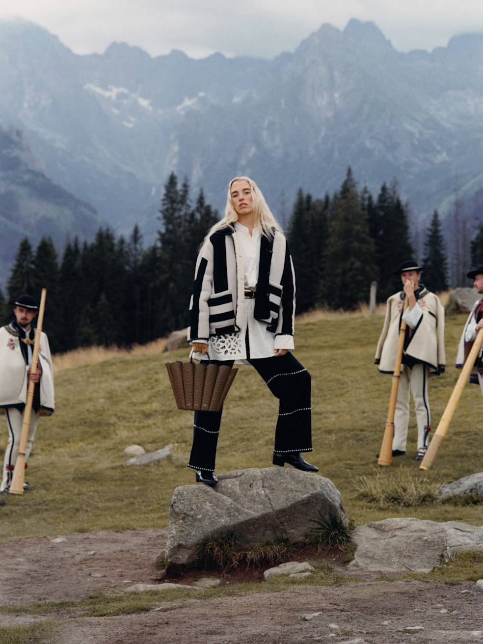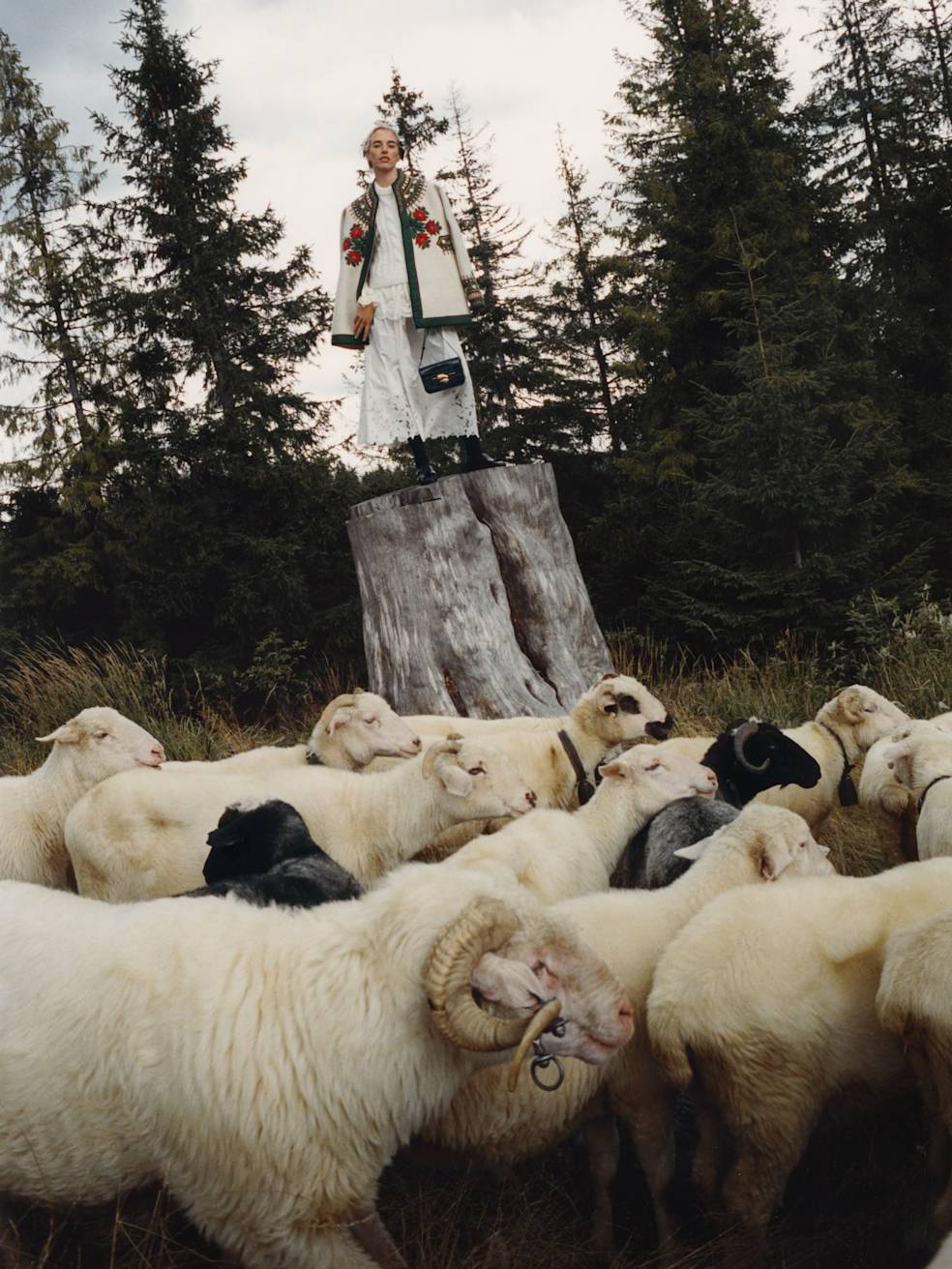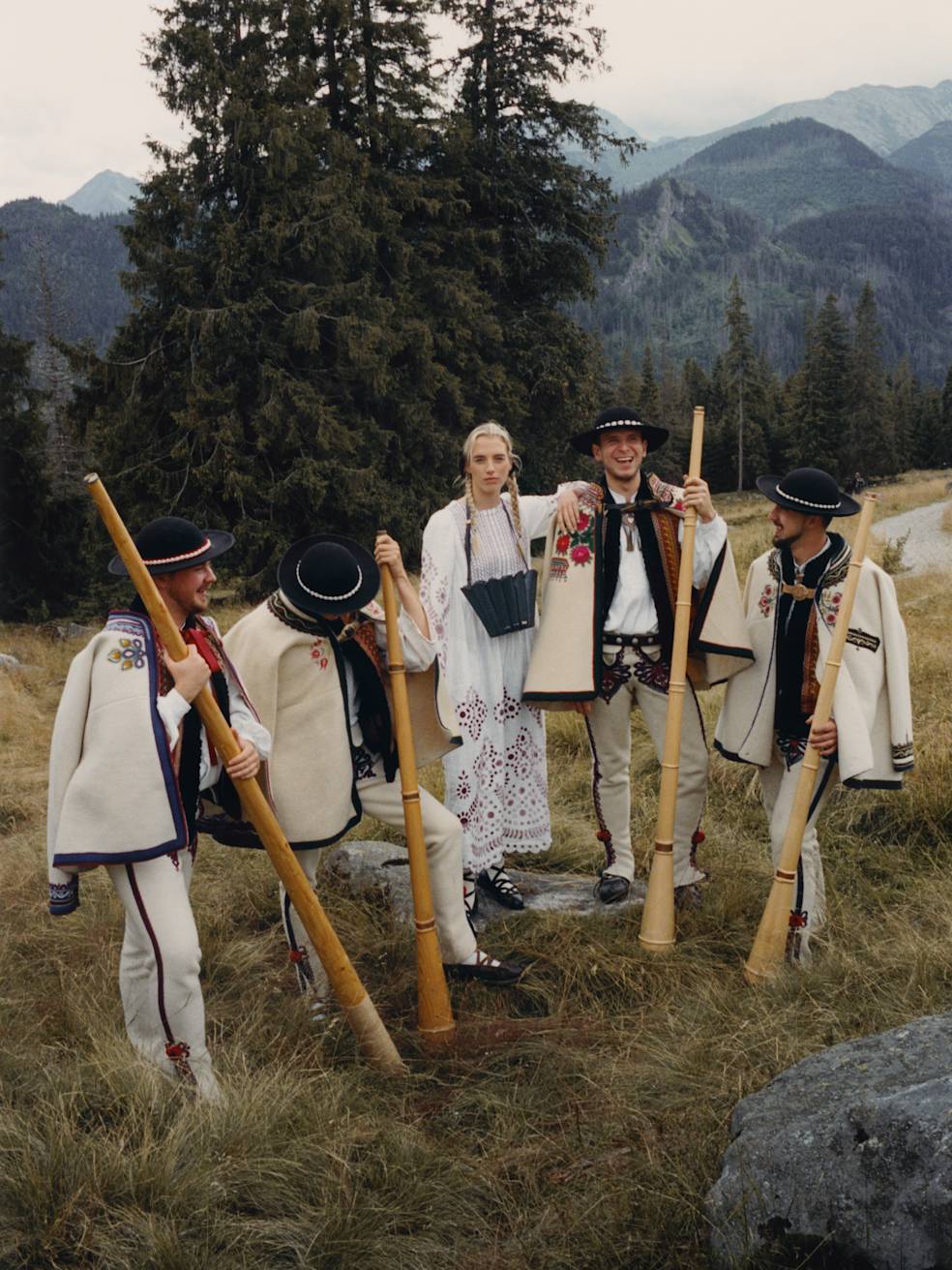The mountains hold a special place in my heart, since my grandparents were raised on the hillsides of the Carpathian range in Ukraine and in Poland. I wanted to show my work surrounded by their beauty. Accompanied by the sounds of the trembita, a long wooden horn, and the highlanders’ bagpipes, we watched the local head shepherd tending to his sheep grazing a large meadow. We also invited the famous “bear” from the resort town of Zakopane to participate in the shoot.