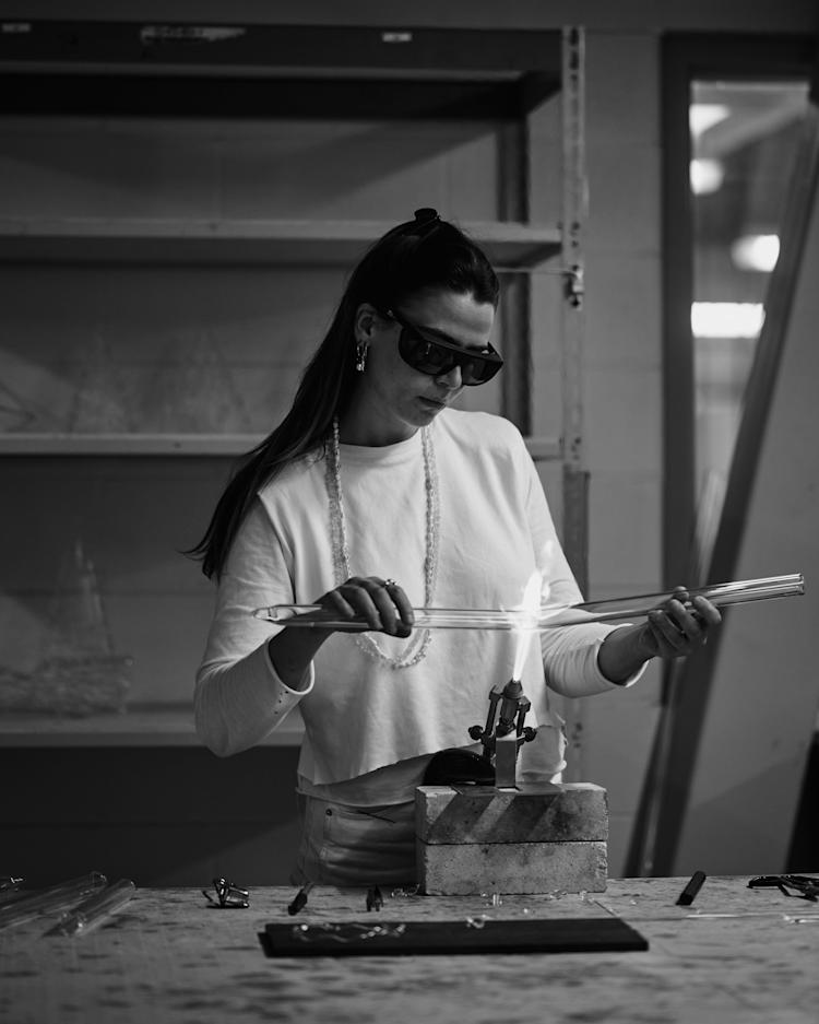 She’s 25 years old and already has a portfolio filled with accolades: a win at the 2020 International Biennale of Glass in Sofia, a distinction from the American Glass Society two years later, two grants from the New York organisation Urban Glass, and a scholarship from Kent State University, where she teaches glassblowing. If there’s a stereotype of what an industrial glassworker looks like, Filomena Smoła is its polar opposite. She’s very stylish with her long, flowy hair, white embroidered shirt, and custom jewelry, and looks far too dainty to be spending all day in the heat of the glassworks. But let’s not be fooled by appearances.