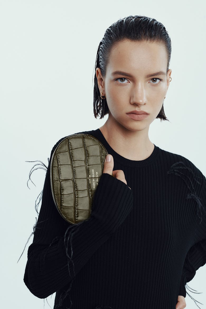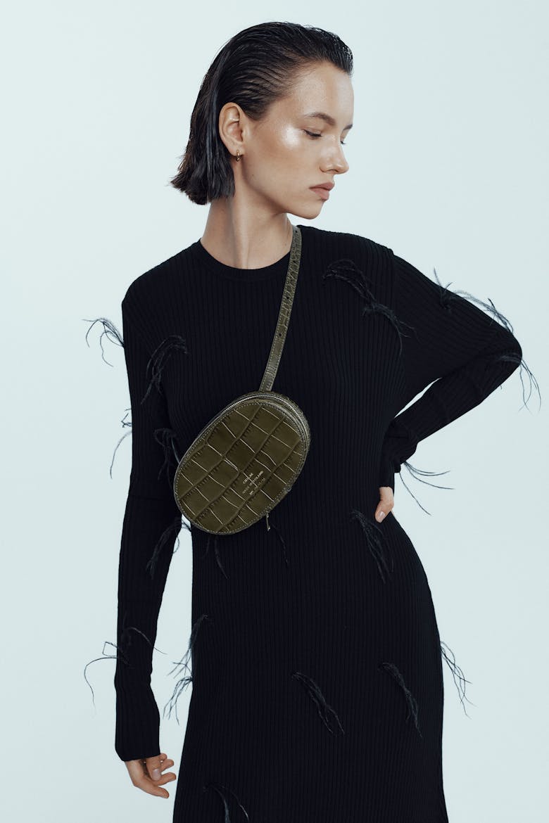 Structured, oval-shaped bag made of olive-green leather embossed in a crocodile-skin pattern. Can be worn across the body, on the waist, or as a clutch. Built-in mirror and drawstring pouch.