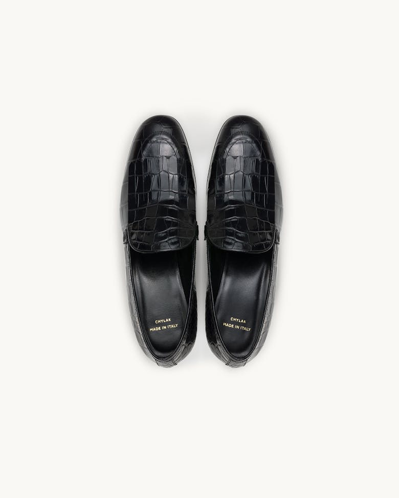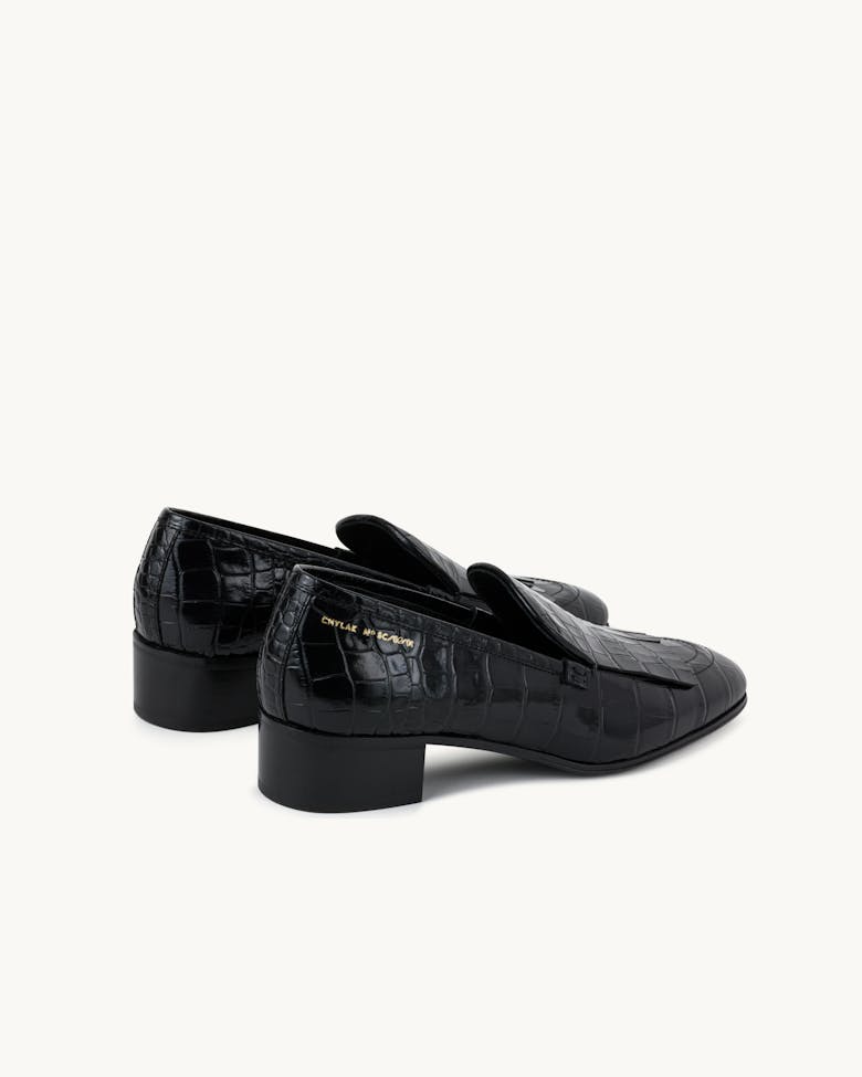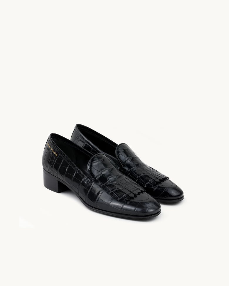 A classic almond-toe loafer with meticulously cut fringe detailing. Casual but elegant, with a bit of flair. Series number hand-stamped in gold, heel height 3,5 cm. Made in Italy, available in two finishes: smooth black leather and our signature glossy black crocodile-embossed leather.