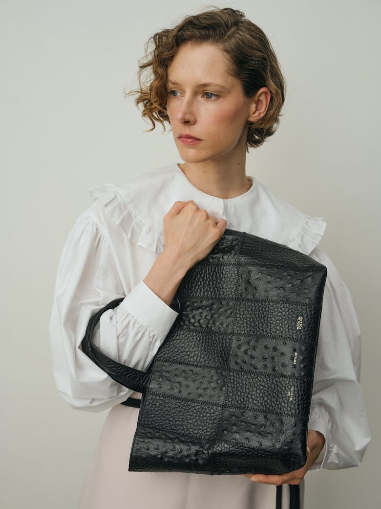 A square-shaped shopper constructed from ostrich-embossed and pebbled leathers. Joined with decorative zigzag stitching, the textured leathers form a monochromatic, but contrasting patchwork. Worn on the arm. Closed with leather ties. A zippered pocket diagonally divides the interior into two compartments. Additional small zippered pocket inside. Organized and chic.