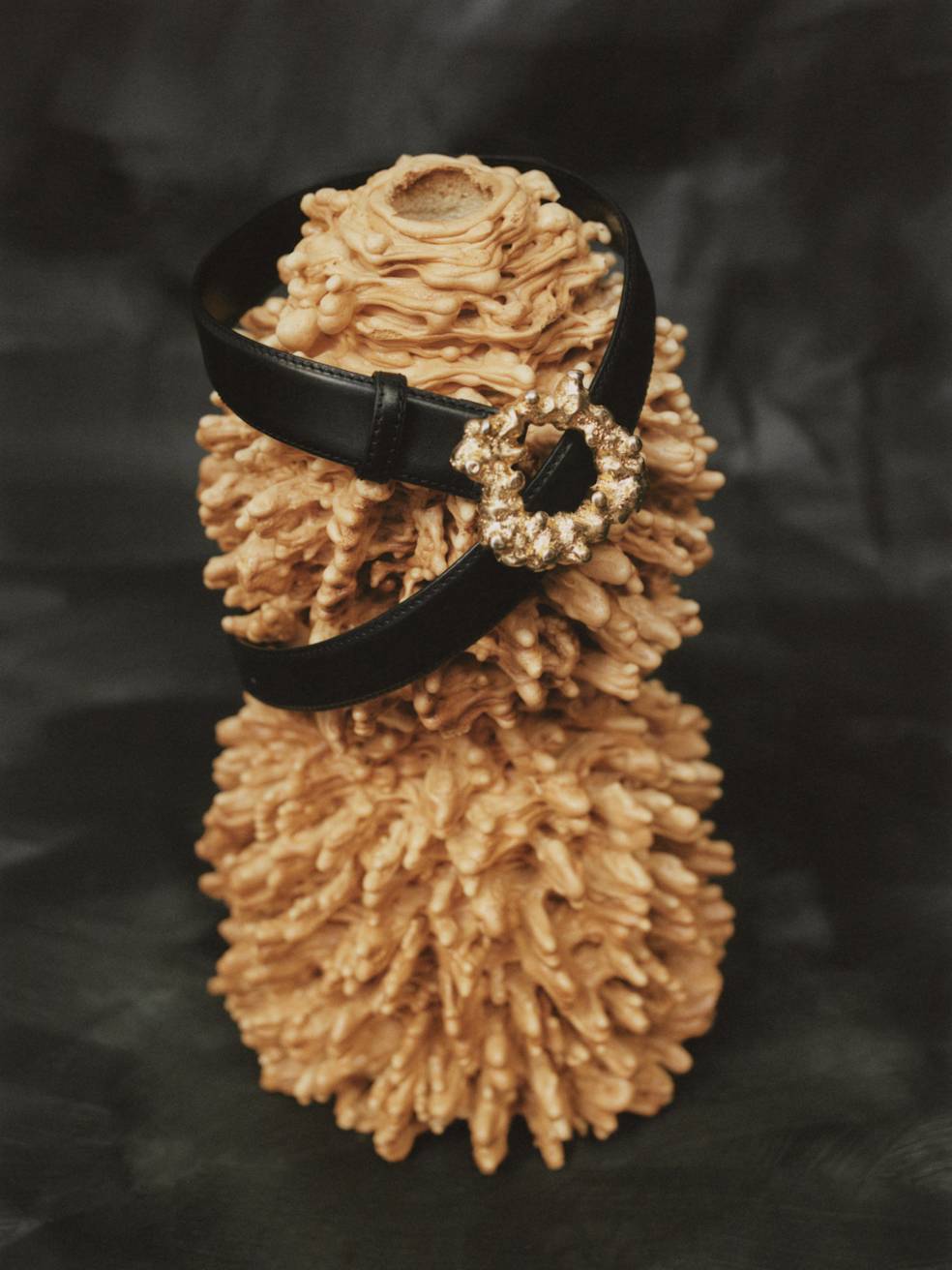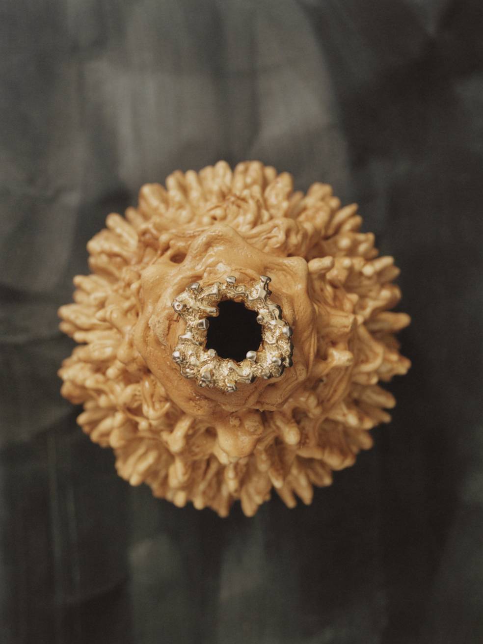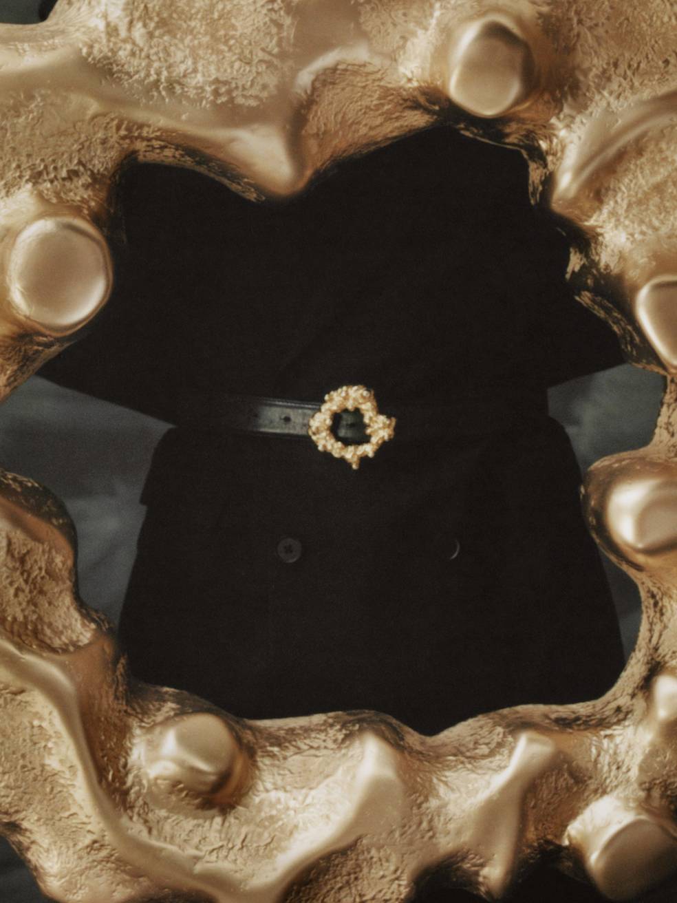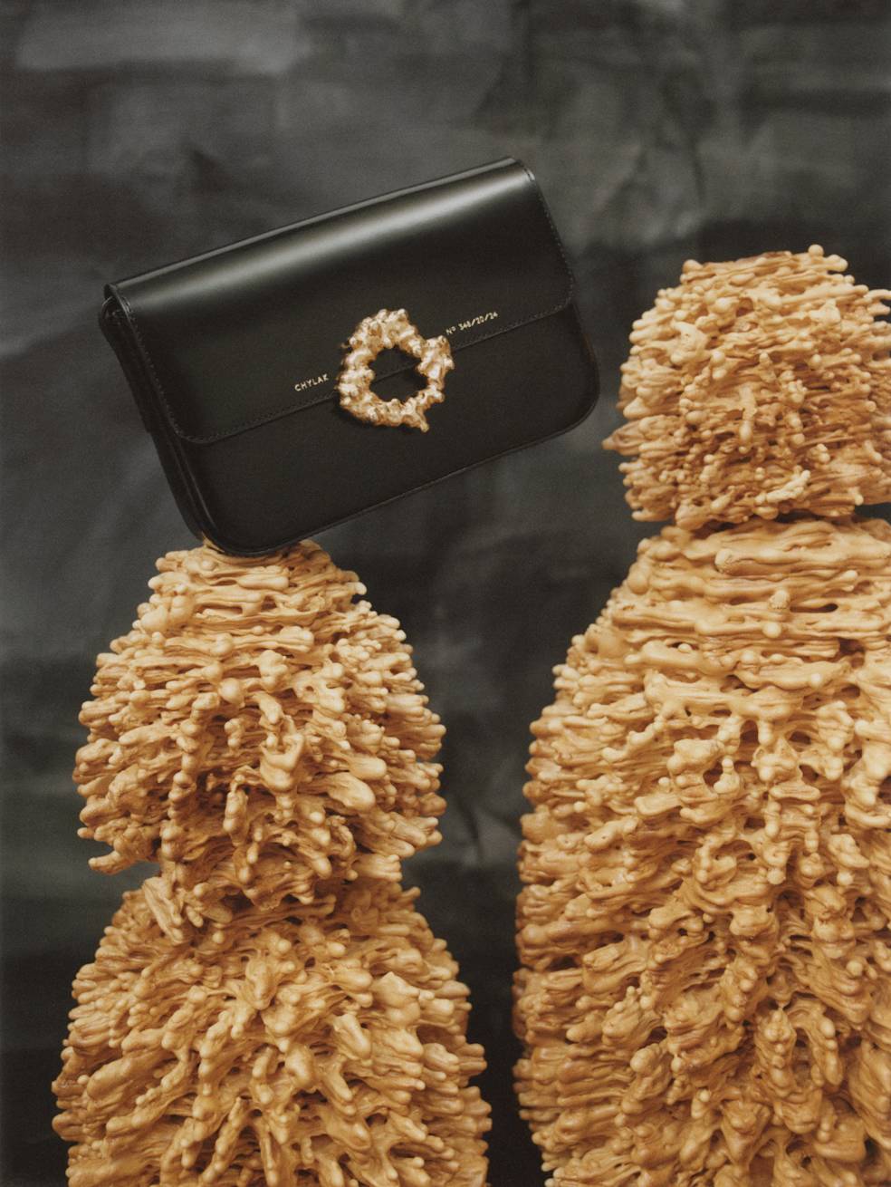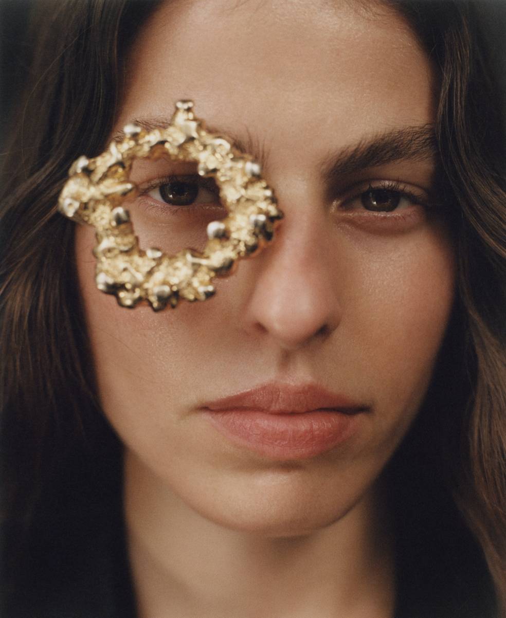 The leading motif for this mini collection is a decorative golden clasp. Its organic form recalls a traditional layered cake baked on a spit over an open fire in eastern Poland. Called “sękacz” (“knotted”, because of its tree-like rings), the cake has a long history on Polish lands, prepared for special occasions, holidays, and weddings at least since the end of the 15th century. Thanks to its unique, ornamental shape, it served as an adornment for every table.